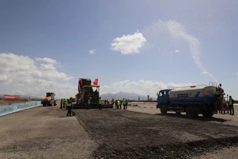 5月28日,伴隨著第一車水泥穩定砂礫混合料緩緩倒入攤鋪機料斗,標志著由我司承建的新疆和靜(巴音布魯克)機場飛行區跑道水穩基層試驗段施工正式拉開序幕。